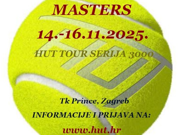 HUT TOUR SERIJA 3000 Zagreb, TC Prince, 14.-16.11.2025. Pred nama je 13. završni MASTERS 6 prvoplasiranih igrača/ica po kategorijama sa HUT pojedinačnih rang listi. Pozivaju se svi igrači/ice da do ponedjeljka 10.11.2025. do 10:00 sati potvrde sudjelovanje na MASTERS-u on-line ili tel: 098 228 523